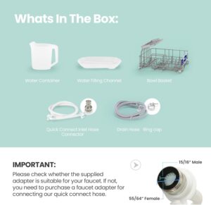 - Option 2 – Faucet connection: Alternatively, you can connect the inlet hose to a faucet with the supplied adapter, then attach the drain hose to the rear outlet and position its end inside a sink or container.