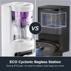 • The self-emptying dock uses a bagless design, eliminating the need for disposable bags, though the base container still requires manual emptying once it’s full. The manufacturer estimates a 45–60 day capacity, but real-world results may differ depending on use.